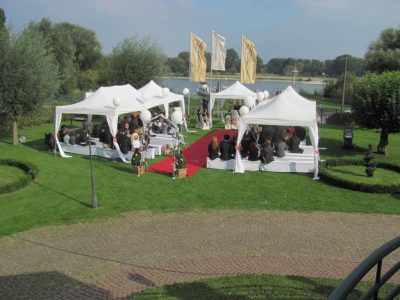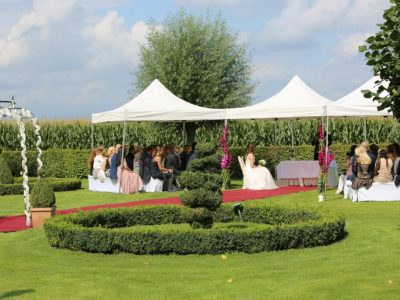 Wir bieten eine Pauschale an, diese beinhaltet 20 Bänke mit weißen Hussen und Schaumstoffauflagen, 5 Pavillons 3m x 3m, einen roten Teppich sowie einem Spalier